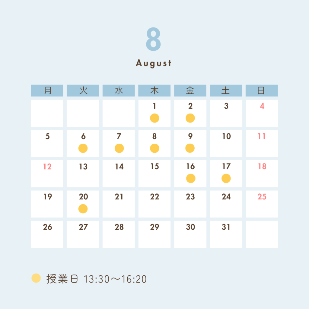 7/24(水)〜8/20(火)までの14日間、13:30〜16:20の50分×3コマで行います。